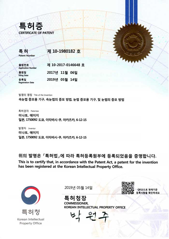 その増毛技術のパイオニアである湊英次が、十数年の歳月と、これまでのノウハウを積み重ね、この度まつ毛増毛における特許を取得いたしました。